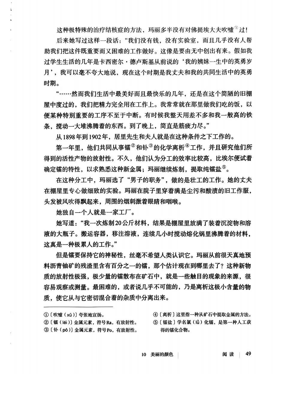 居里夫人一生淡泊名利,她曾表示:“在科学上,我们应该关注事而不是人。”她没有为镭的提取方法申请专利,而是将之公之于众,以便全世界的科学家都能继续研究。当有人建议她申请专利以确保财富时,她回答:“镭是一种元素,它属于全世界。”《美丽的颜色》入选中学语文教材,正是希望青少年学习居里夫人那种追求真理、坚韧不拔、无私奉献的科学精神。正如课文最后所写:“那略带蓝色的荧光照亮了黑暗的棚屋,也照亮了科学的未来,更照亮了无数科学探索者前行的道路。”