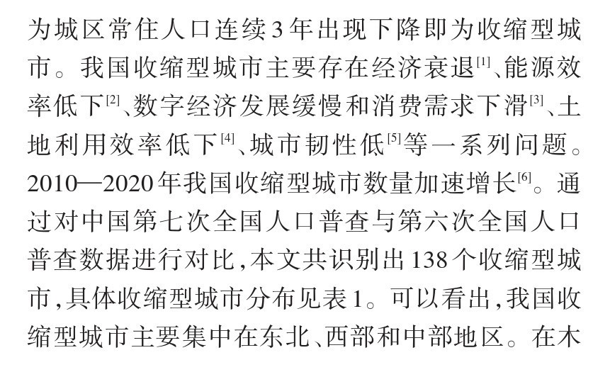这三位学者是如何得到这份名单的呢?论文有交代:“国际研究机构收缩型城市国际研究网络(SCIRN)将人口规模在1万以上的人口密集城市区域,面临人口流失超过2年,并经历结构性危机的城市初步判定为收缩型城市。国内相关研究一般认为城区常住人口连续3年出现下降即为收缩型城市。我国收缩型城市主要存在经济衰退、能源效率低下、数字经济发展缓慢和消费需求下滑、土地利用效率低下、城市韧性低等一系列问题。2010—2020年我国收缩型城市数量加速增长。通过对中国第七次全国人口普查与第六次全国人口普查数据进行对比,本文共识别出138个收缩型城市,具体收缩型城市分布见表1。”