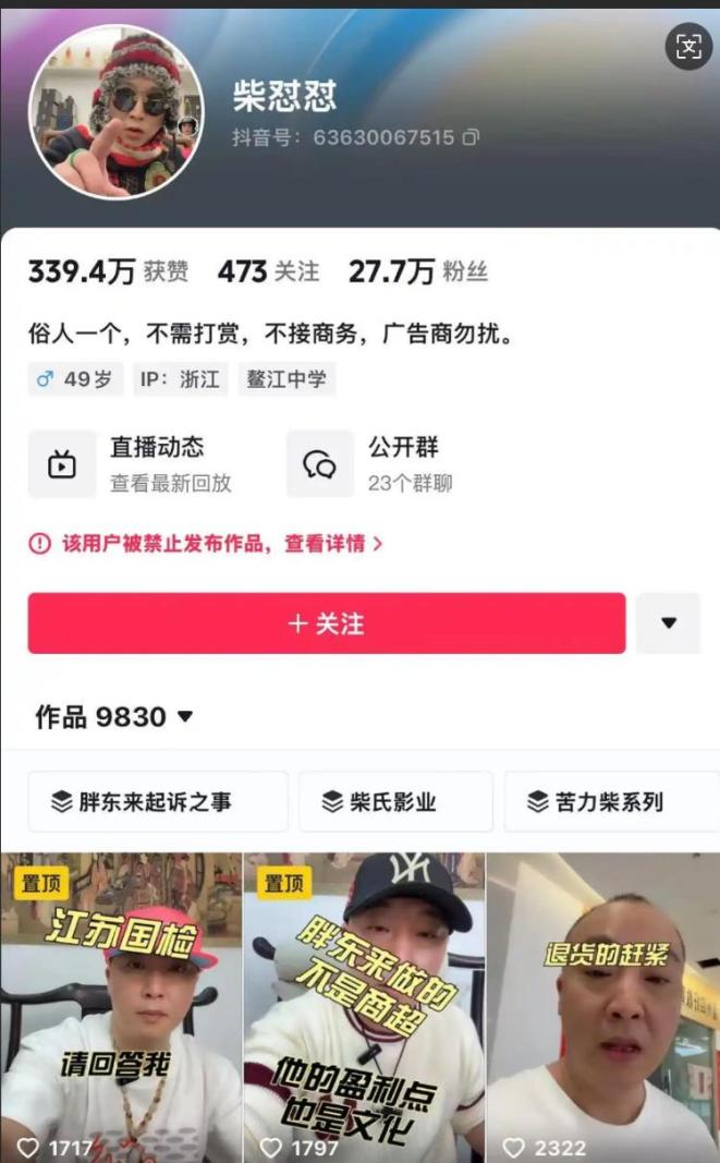 上游新闻记者注意到,被封禁前的“柴怼怼”账号主页截图显示,其IP地址显示为浙江,拥有27万粉丝,个人简介是“俗人一个,不需打赏,不接商务,广告商勿扰”。视频作品9800余件,其中“胖东来起诉之事”被制成了视频合集,放在最前面。