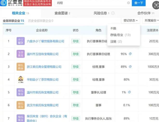 企查查APP显示,柴向前(“柴怼怼”)夫妻名下有多家关联企业。 网络图企查查APP显示,柴向前(网名“柴怼怼”)名下共关联25家企业家,其中7家已注吊销,温州市柴氏珠宝有限公司、温州道莱珠宝有限公司、温州市道莱玉雕有限公司等为存续状态。柴向前妻子肖某名下共关联15家公司,其中两家注销,13家存续,柴向前夫妇目前合作11家公司。
