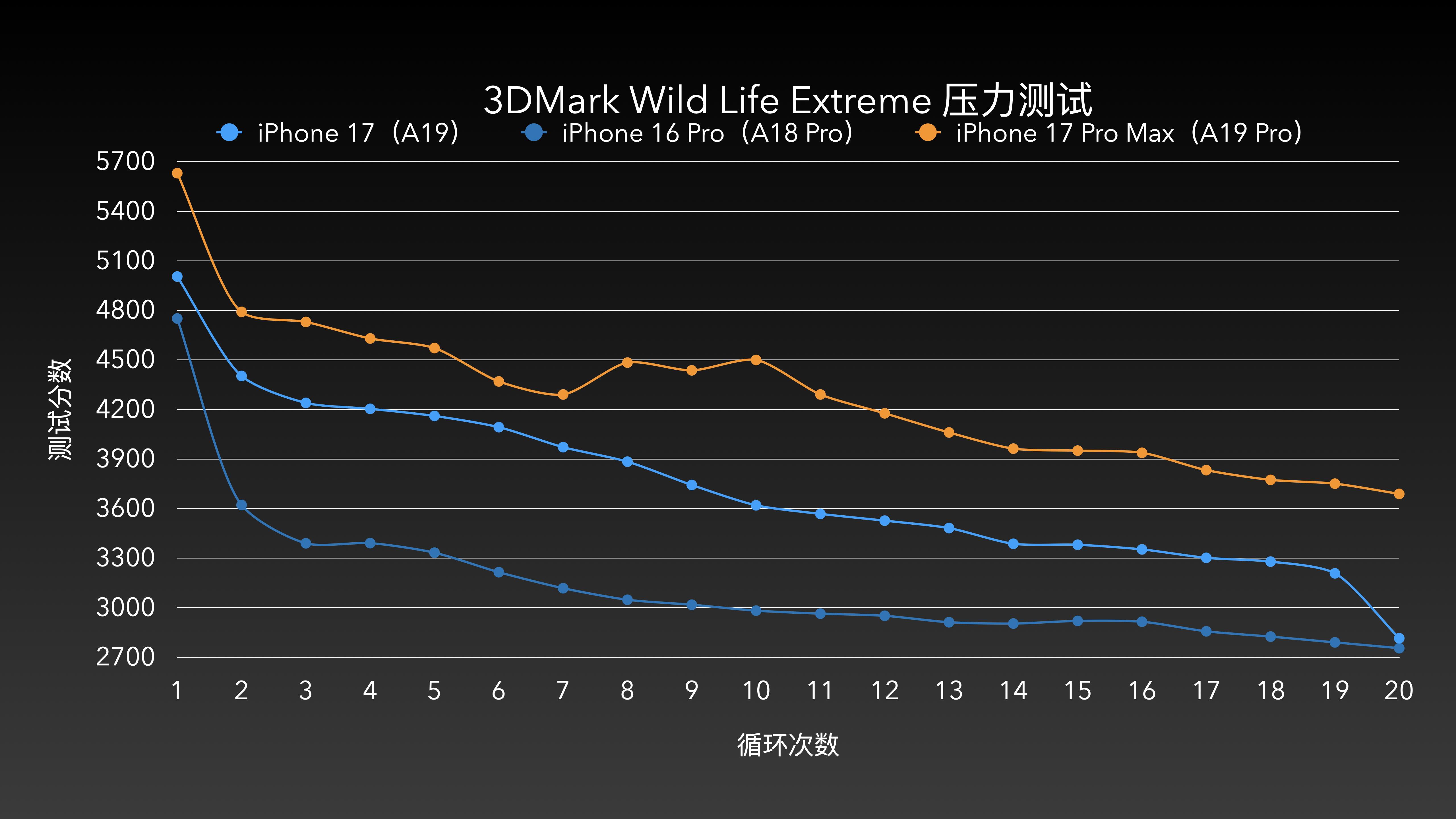 在 Wild Life Extreme 压力测试(20 循环)后,iPhone 17 和 iPhone 16 Pro 的分数差距从第一循环的 5% 扩大至 16%;前者稳定性接近 64%,后者却只有 57%。