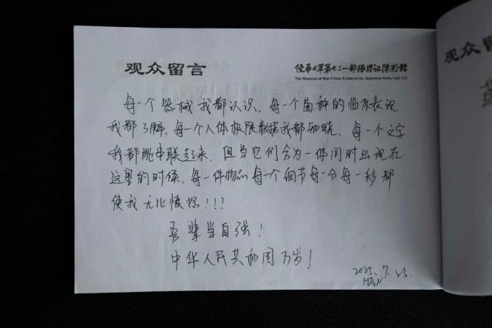 参观者在侵华日军第七三一部队罪证陈列馆内留言。新华社记者 张涛 摄原标题:《真实的“731”更残酷,探访侵华日军第七三一部队罪证陈列馆》