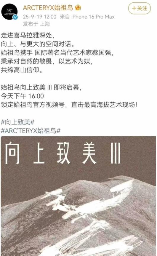 9月19日,安踏集团旗下亚玛芬体育的品牌始祖鸟联手艺术家蔡国强在喜马拉雅山燃放烟花引发热议。