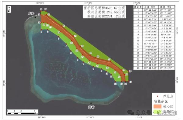 黄岩岛国家级自然保护区功能区划图,其中绿色为实验区,红色为核心区