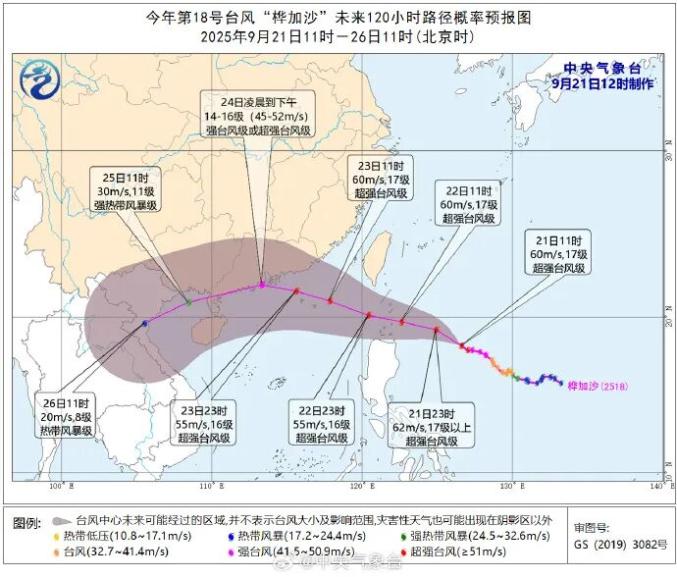 根据广东省气象台的最新预测,“桦加沙”将于22日夜间穿过巴士海峡,23日凌晨进入南海东北部海面,趋向广东海面,并有可能于24日前后(较大可能24日凌晨至下午)以强台风级或超强台风级(15—16级)在广东中西部沿海地区登陆。