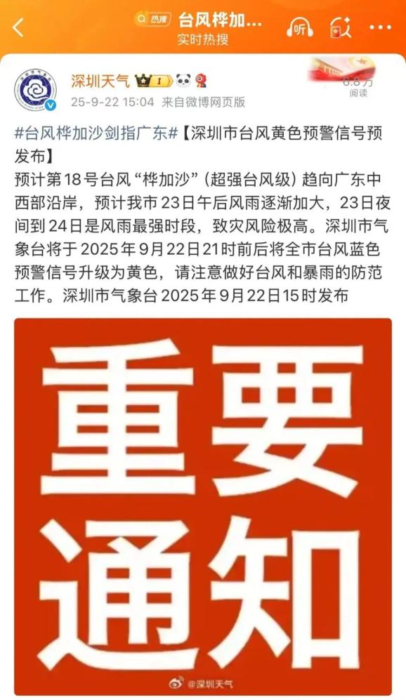 【深圳市台风黄色预警信号预发布】预计第18号台风“桦加沙”(超强台风级)趋向广东中西部沿岸,预计我市23日午后风雨逐渐加大,23日夜间到24日是风雨最强时段,致灾风险极高。深圳市气象台将于2025年9月22日21时前后将全市台风蓝色预警信号升级为黄色,请注意做好台风和暴雨的防范工作。深圳市气象台2025年09月22日15时00分发布
