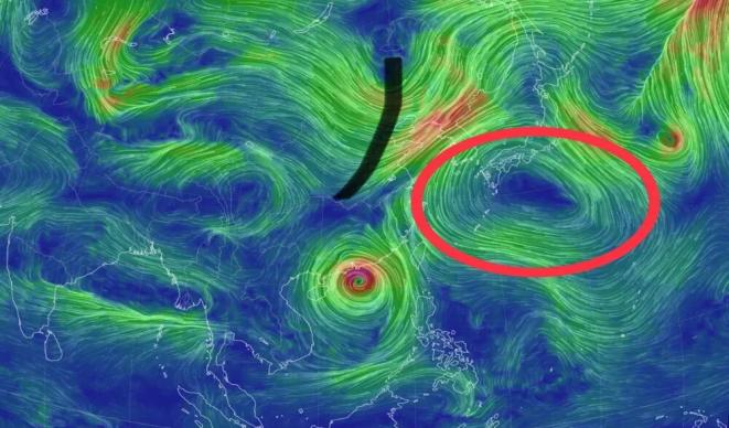 9月24日清晨对流层中层(约5500米高度)的风场情况。红圈为副热带高压,黑色线条为高空西风槽(它的东移使得副热带高压向东退却) 图片来自 earth.nullschool.net