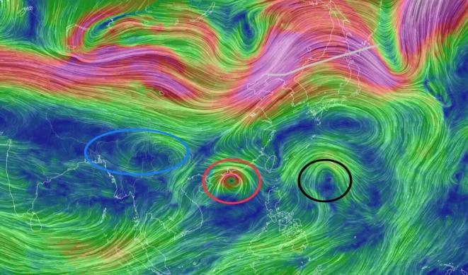 同上图,但为对流层高空(约10000米高度)的风场形势。红圈为台风桦加沙的高空环流,黑圈为高空冷涡,蓝圈为南亚高压。图片来自 earth.nullschool.net