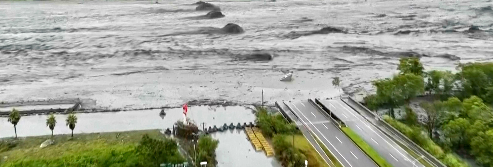 9月23日,台湾花莲,超强台风“桦加沙”带来强降雨,导致山体滑坡形成的堰塞湖决堤,洪水淹没居民区,车辆被困。