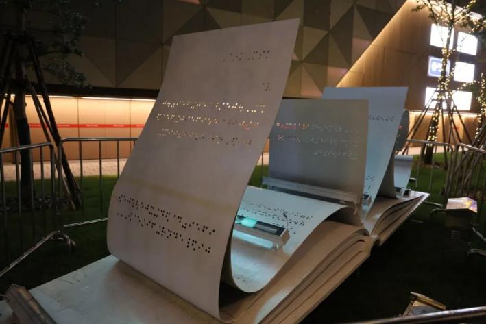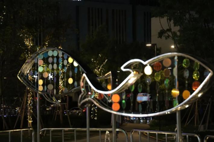 3号门广场上,《鱼跃星光》《触·光》两大装置已安装完毕。《鱼跃星光》以鱼形为基础,挂满五彩的亚克力鳞片,微风拂过时鳞片轻晃,灵动十足;《触·光》则设计成翻开的书页模样,内部刻满盲文,将人文关怀融入艺术设计,细节处尽显温度。
