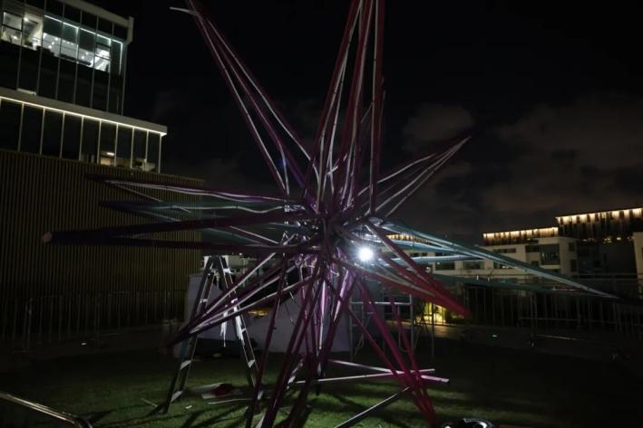 屋顶露台上,巨型“星耀”装置已完成雏形搭建。星星造型的主体搭配散布的灯光,将打造一场氛围感十足的“屋顶派对”——既能近距离观赏装置细节,也可在2号门广场远眺其与建筑的融合之美,实现“近赏远观皆成景”。