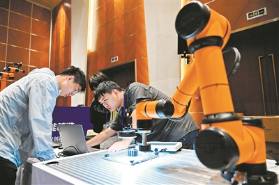 2025年中国大学生机械工程创新创意大赛智能精密装配赛京津冀鲁联赛举行,旨在全面考察学生的创新思维与技术应用能力。图为参赛选手在比赛中调试设备。