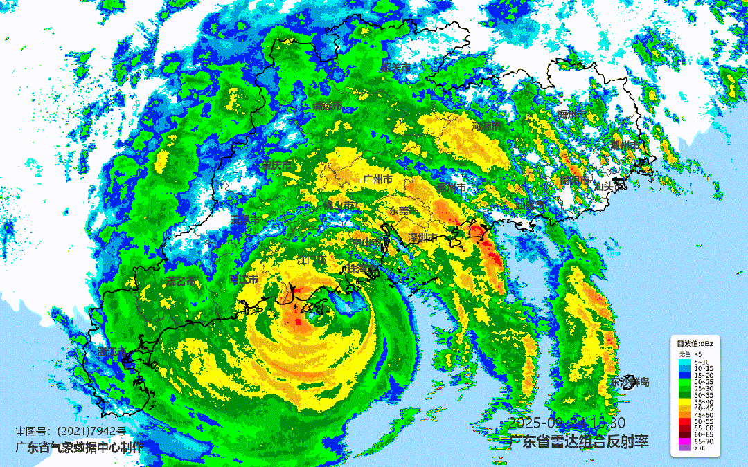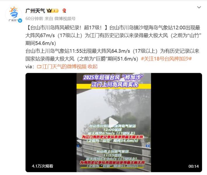 台山市川岛镇沙堤海岛气象站12:00出现最大阵风67m/s(17级以上)为江门有历史记录以来录得最大极大风(之前为“山竹”期间54.6m/s)。台山市上川岛气象站11:55出现最大阵风64.3m/s(17级以上)为有历史记录以来国家站录得最大极大风(之前为“巨爵”期间51.6m/s)。