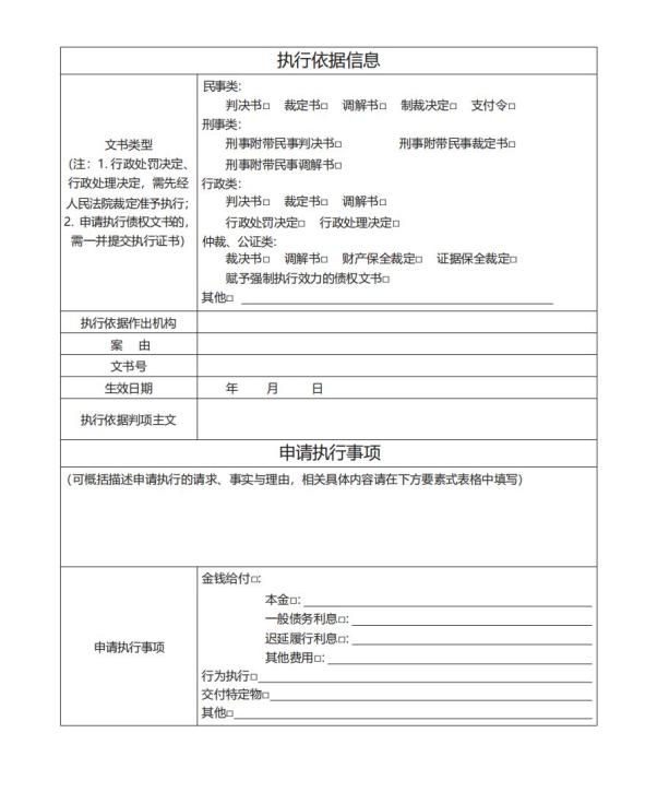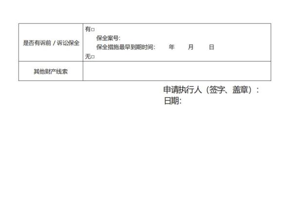 (三)申请执行事项部分。该部分在填写时应根据要素式申请书提示,金钱给付的填写本金及利息的具体数额,行为执行的填写具体行为。在诉前、诉中有保全的填写保全案号及保全措施最早到期时间。如能够提供被执行人财产线索,即在对应栏填写具体财产情况。