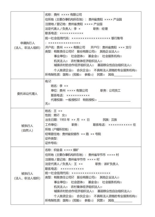 (一)当事人信息部分。该部分应准确写明申请执行人及被执行人的身份基本情况”。自然人在对应栏填写姓名、性别、出生日期、住所地、证件号码等自然信息;法人和非法人组织注意应根据工商登记信息在对应栏进行填写、勾选。
