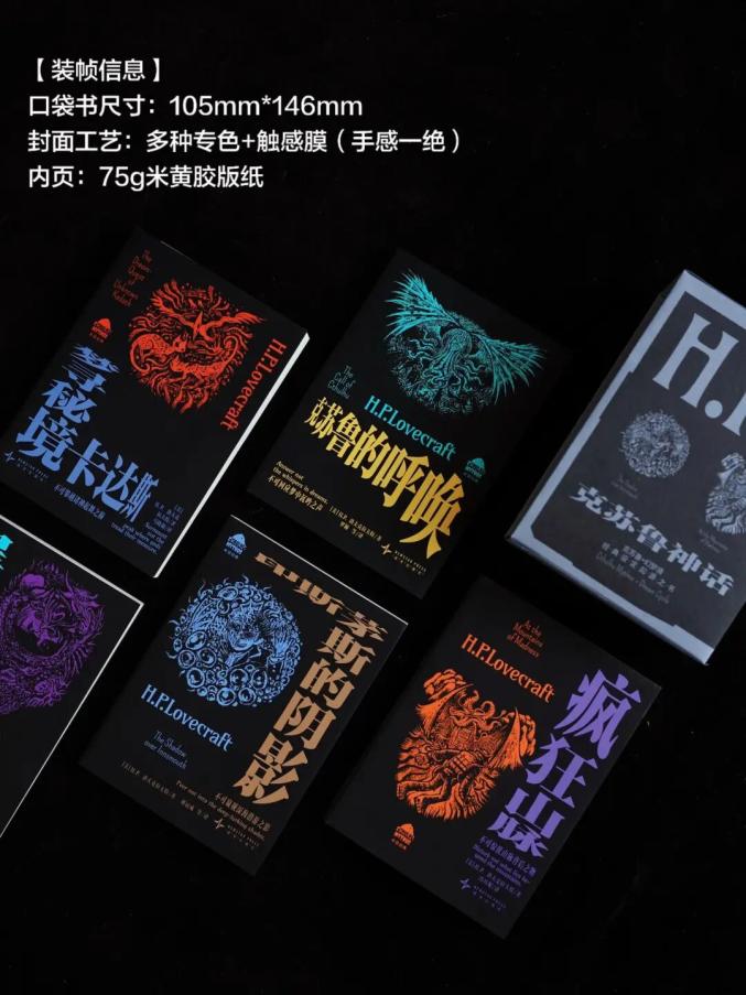 《疯狂山脉》的冰封奇观、《印斯茅斯的阴影》的潮湿压抑、《梦寻秘境卡达斯》的梦幻斑斓……都藏在这浓烈的色彩与线条中。除此之外,每一本书的封底上都附有一小段仿真“伪文献”,作为翻开这一份份“禁忌档案”之前的小小热身。