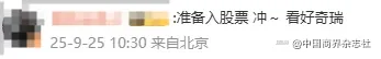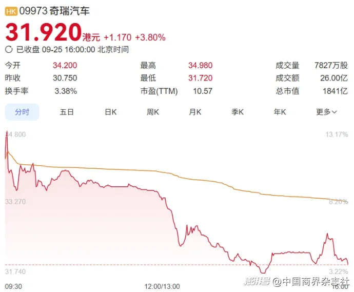 9月25日,奇瑞汽车正式在港交所挂牌上市。上市当日,其股价表现强劲,大幅上涨超过13%,市值一度超过2000亿港元。截至收盘,奇瑞汽车股价稍有回落,报31.92港元/股。