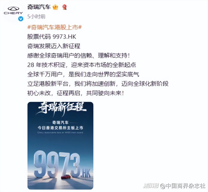 奇瑞在港交所挂牌上市,港股新机会来了?