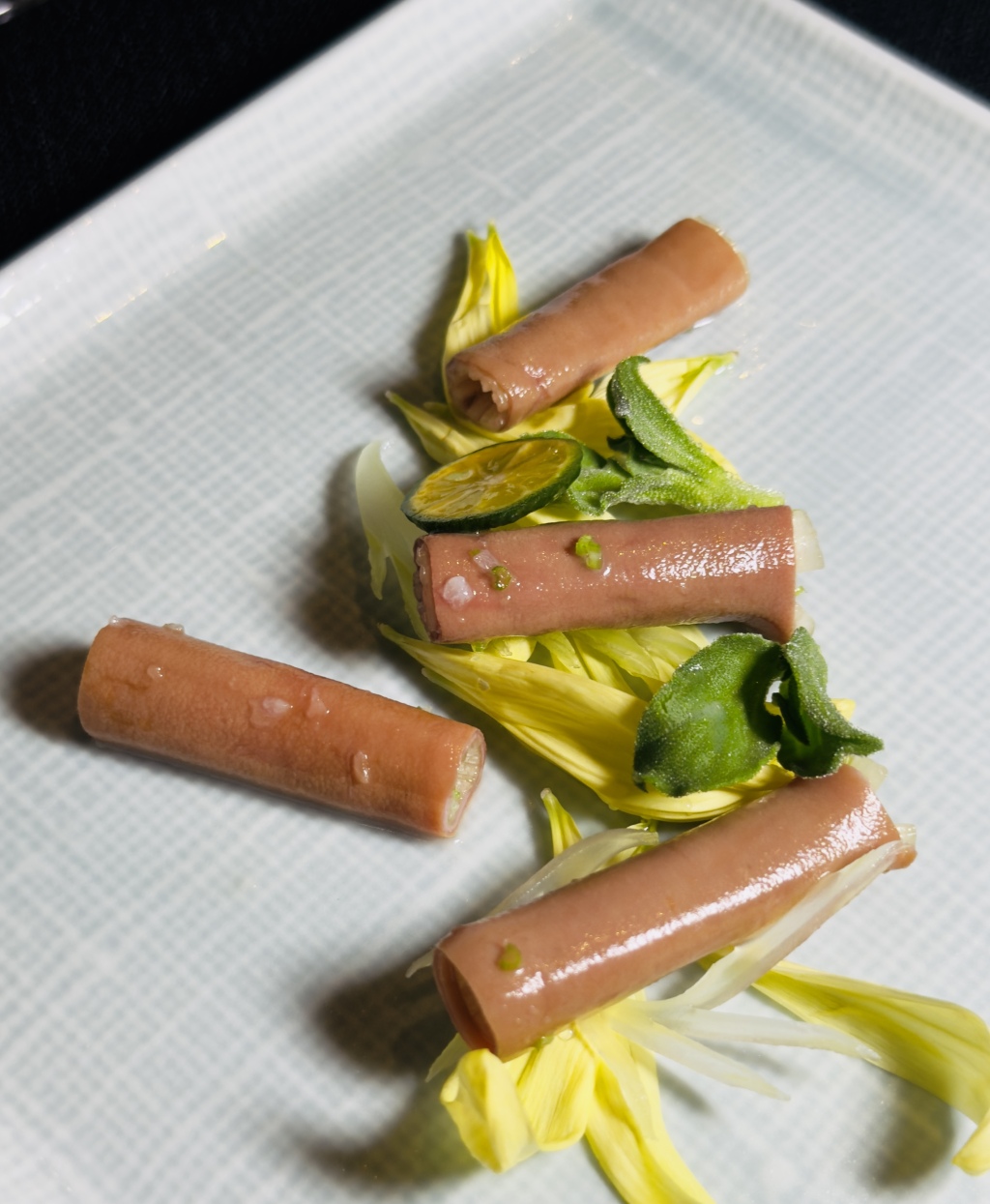 自古以来,酒楼食肆里就不以海肠招待客人,它就没有上桌的机会。不过海肠的价值在于它是中国第一代的天然味精,关于它的故事,我曾经写过文章,在此不再赘言了。但鲁采这次将它做成冷菜,确是一趟冒险的旅程。不过,年轻的厨师足够聪明,他们将可以生食的马家沟芹菜塞进汆熟后马上冷激的海肠腹腔中,不仅让海肠有了身子骨,造型拗得也略带弧度,饱满而性感。入口咀嚼,海肠不再有扯拉不动的尴尬,倒是又鲜又脆又爽,鲜味十足。小小的创意,使海肠有了更大的表现空间。只有对海肠性状有足够的了解,才会将它与芹菜来个嫁接。诚如鲁采的王洪岩店长所言:这是一次海洋与陆地最直接、最爽快的握手。