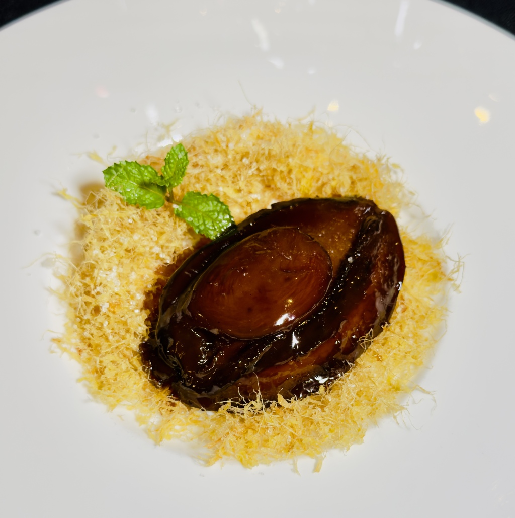 乳山糖姜焗两头鲍也是一道硬之又硬的压桌子大菜,同样位上。厨师选用乳山的大姜,切丝后再经腌渍和油炸,制成辛香并美的糖姜丝。来自南隍岛的两头鲍,本身足够肥硕,参以港粤溏心干鲍的烹饪工艺,辅料与火候的精准把控,同样让食客获得软糯醇厚的口感,银刀一划,也有溏心的效果。糖姜本身是热性的,借以中和鲍鱼的微寒,这就体现了秋日食疗养生的理念。