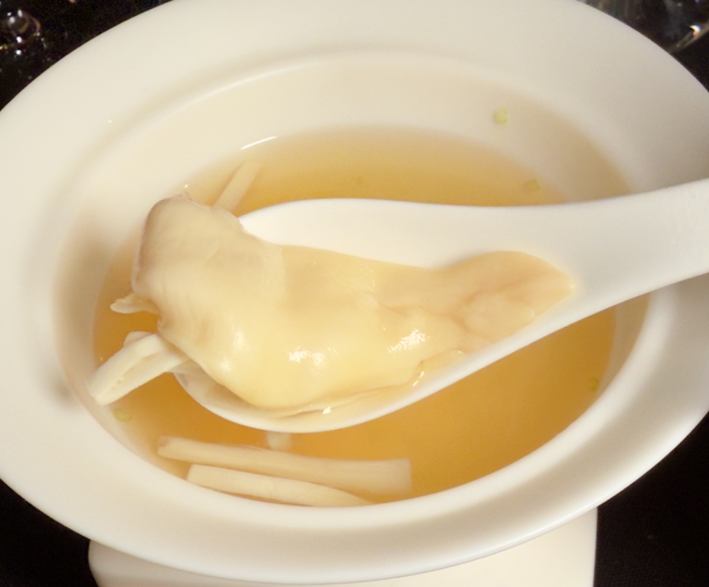 芋香鲜贝花这道冷菜也别具一格,夏威夷鲜贝每个有网球那般大,厨师轻轻剞花,在低温高汤里汆熟,就使它变成一朵玉白色的花朵。再用炸得酥香的芋艿丝垫底,辅以他家自腌的糖蒜片,碧绿的葱油那么一浇,色泽无比诱人。