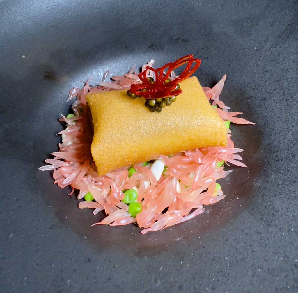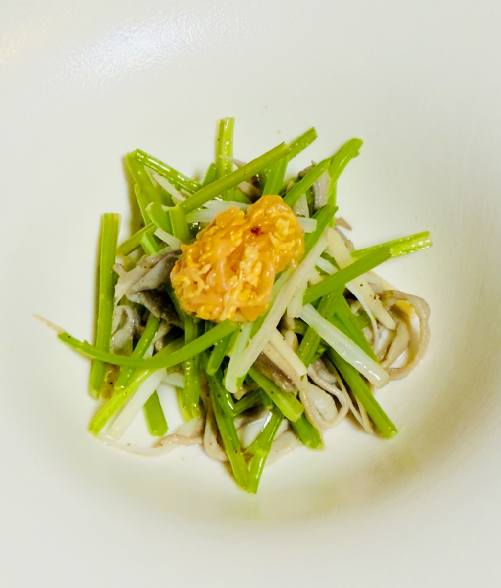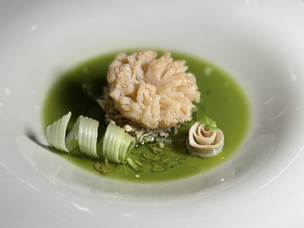 鲁采的厨师以鲁菜特有芫爆技法烹制这道菜,猛火快炒,用香菜梗的香气激发并衬托出海龙筋的至纯本鲜。这道菜不见山海之形,却汇聚了海洋的珍贵与陆地香草的奔放,体现鲁采厨师的匠心。