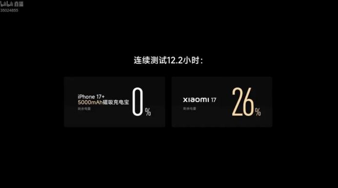 小米在现场更是演都不演了,直接公开了小米17 对比 iPhone17 的重度续航测试——连测 12.2 个小时,在 iPhone 17 耗完自身电量,外加 5000mAh 磁吸充电宝续命的情况下,直到 iPhone17 关机,小米17 还能有 26% 的电量。