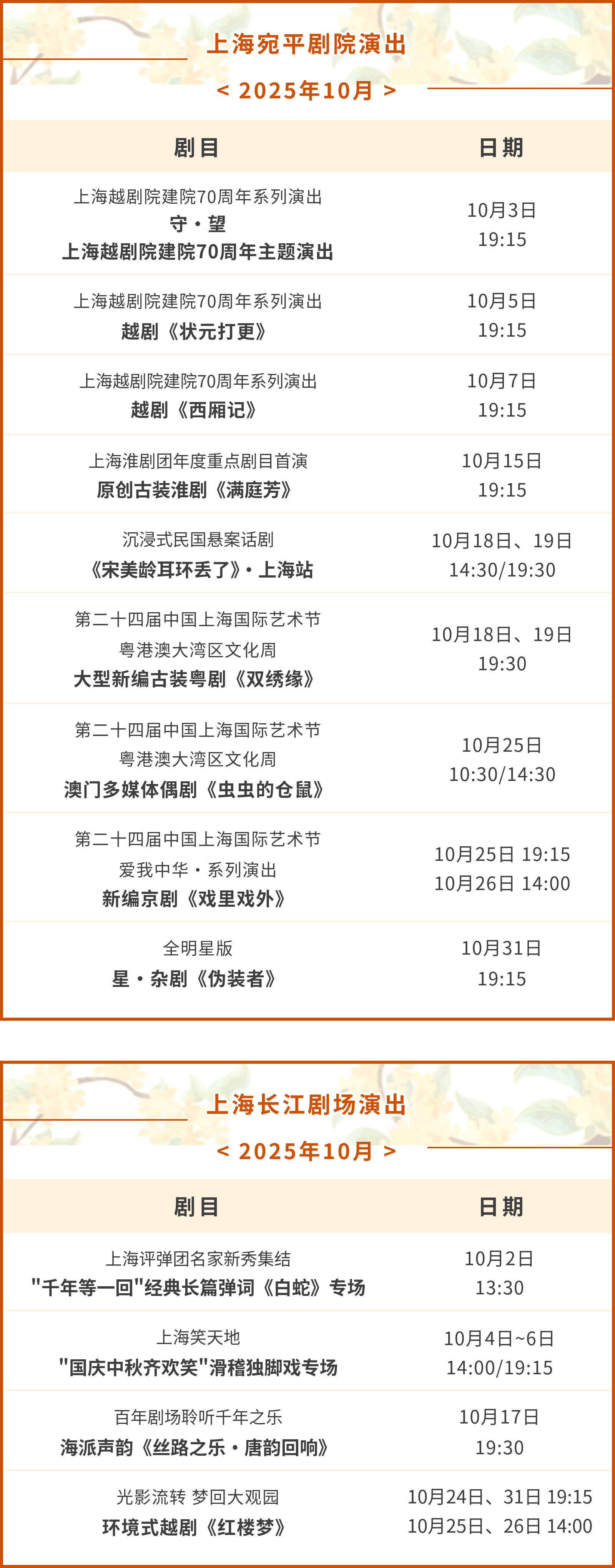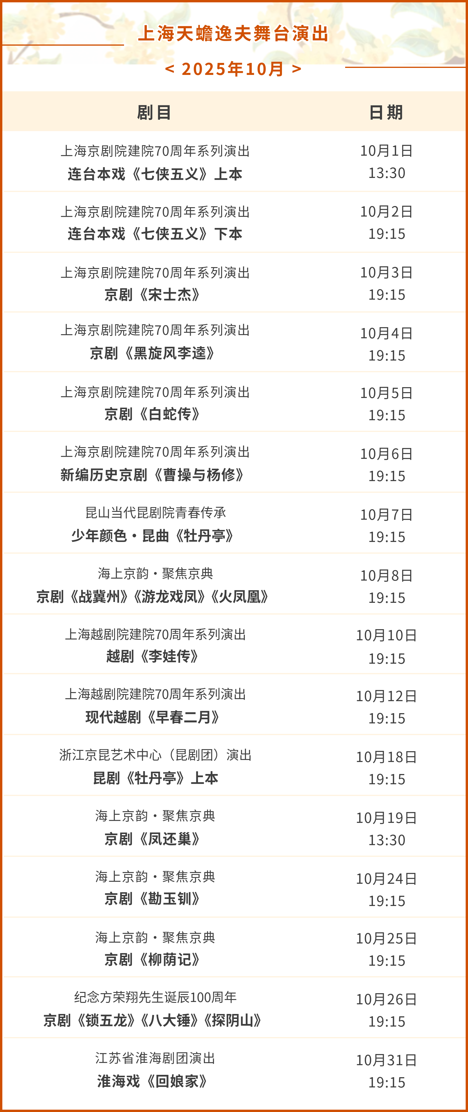 为庆祝建院70周年,上海京剧院《七侠五义》等5部经典保留剧目国庆连演,上海越剧院推出主题演出“守·望”和6部精彩大戏;昆剧《太和正音——故宫昆曲萃集》(第一季)作为开幕演出亮相本届中国上海国际艺术节;五代沪剧演员齐聚《“人盼成双月盼圆”沪剧折子戏专场》,评弹名家新秀带来长篇弹词《白蛇》专场,以经典贺佳节;原创古装淮剧《满庭芳》迎来首演,讲述巾帼英雄的传奇人生......