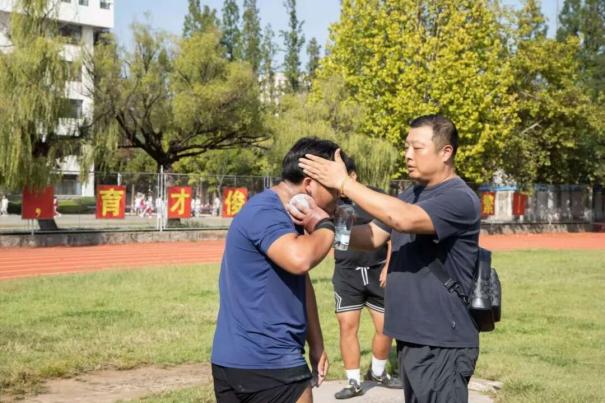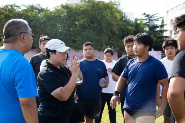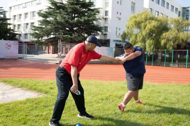 活动伊始,三位冠军直奔学校运动场,将 “冠军课堂” 搬到训练一线。此时,日照一中铅球队学子正专注投入训练,持球、旋转、出手的动作反复打磨。看到年轻身影的拼搏模样,冠军们立刻投入指导,与带队教练赵勇细致交流队员训练情况。