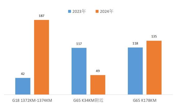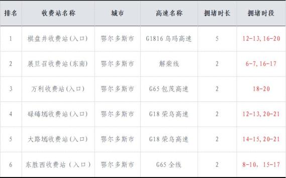 基于2023年、2024年高速拥堵分析结果,预计2025年国庆期间,G18 1372KM-1374KM(准旗大路墕收费站附近)、G65 K34KM(达旗G65连接线德胜泰村附近)、G65 K178KM(伊旗成陵立交附近)为易拥堵点。