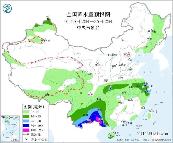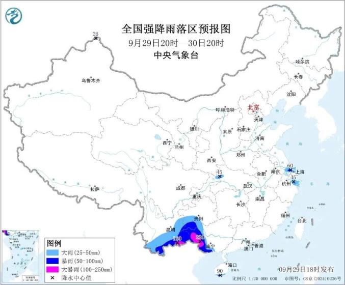 预计,9月29日20时至30日20时,海南岛南部、广西西部和南部、云南东部和南部、贵州西部以及重庆北部、湖北西部、江苏东南部、上海北部、浙江东北部等地的部分地区有大雨或暴雨,其中,广西西部、云南东南部等地局地有大暴雨。上述部分地区伴有短时强降水,局地有雷暴大风等强对流天气。