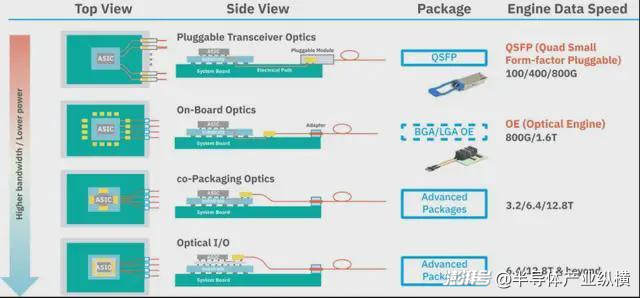 根据下图的前两个示意图可知,目前市面上的可插拔光收发器传输速率可达 800G,下一阶段的光引擎( Optical Engine ,简称OE) 已经可安装在ASIC芯片封装周围,这称为载板光学封装( On- Board Optics ,简称OBO),其传输能力可支援至1.6T。