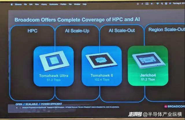 Scale-Out方面,主要由在以太网领域深耕已久的博通占据主导,近期最新推出的产品包括Tomahawk 6、Jericho4,以抢占Scale-Out和更远传输距离的商机。