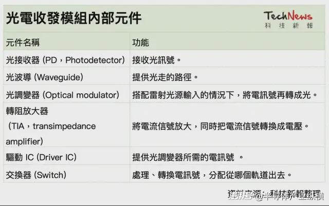 由下图可知,光收发模组由以下关键元件组成,如雷射光源(Laser Diode )、光调变器( Modulator )、光感测器( Photo Detector )等。其中,雷射光源负责产生光信号,光调变器负责将电信号/数位信号转成光信号,因为涉及电光转换,也可以说是决定单通道传输速度的关键。