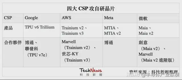 博通与NVIDIA的第一个交集就是“定制化AI芯片”(ASIC)。由于NVIDIA GPU价格高昂,包括Google、Meta、亚马逊、微软等云端服务供应商(CSP)都在开发自家AI芯片,而博通的ASIC能力成为这些公司的首要选择。