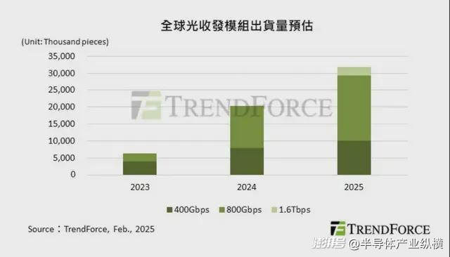 市场调研机构TrendForce预测,2023年400G以上的光收发模组全球出货量为640万个,2024年约2,040万个,预计至2025年将超过3,190万个,年增长率达56.5%。其中,AI服务器的需求持续推升800G及1.6T的成长,而传统服务器也随着规格升级,带动400G光收发模组的需求。