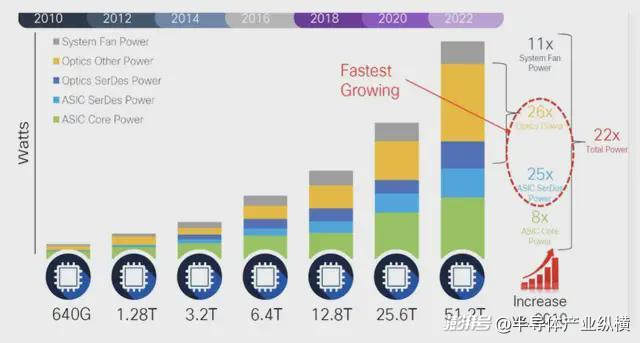 如果仔细观察上图,可以发现作为黄色方块的光通信模组(以前为可插拔形态)距离ASIC越来越近,这主要是为了缩短电信号的传输路径,从而实现更高的带宽。而硅光子制程技术,就是将光学元件整合到芯片上的技术。
