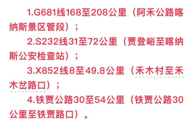 10月3日,“平安喀纳斯”公众号最新发布《关于喀纳斯景区实行道路交通管制的通告》:喀纳斯景区辖区内受降雪天气影响,道路积雪结冰,不具备安全通行条件,于10月3日8时起对以下路段实行临时交通管制。