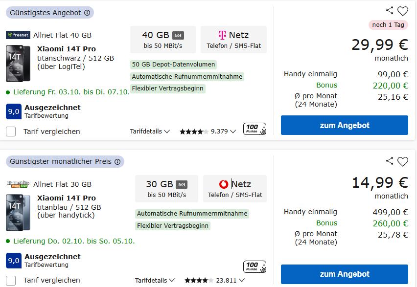 虽然裸机的价格确实贵到飞起,但是如果你选择以运营商合约的形式购买,那价格就实惠不少。以小米14T Pro为例,如果选择o2 Mobile的合约套餐,只需要每个月支付34.99欧元,就能够以39欧元的价格带走这部手机,并获得每个月50GB的流量和无限通话、短信服务,并且套餐使用时间每增加一年,每个月的流量也会增加5GB。