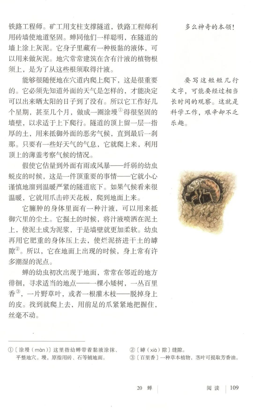 后续观察中,法布尔发现刚出土的蝉满身泥浆,挖开地底若虫后,发现其会渗出透明液体(尿液)。由此他得出结论,蝉若虫用尿液将泥土和成泥浆,涂在洞壁上,既保证通道宽敞,又让墙面光滑结实。他进一步探究液体来源,挖开洞穴发现洞底有新鲜树根,原来蝉若虫靠吸食树根汁液获取食物与液体,可见其洞穴选址经过精心考量,蝉的一生也与树紧密相连。