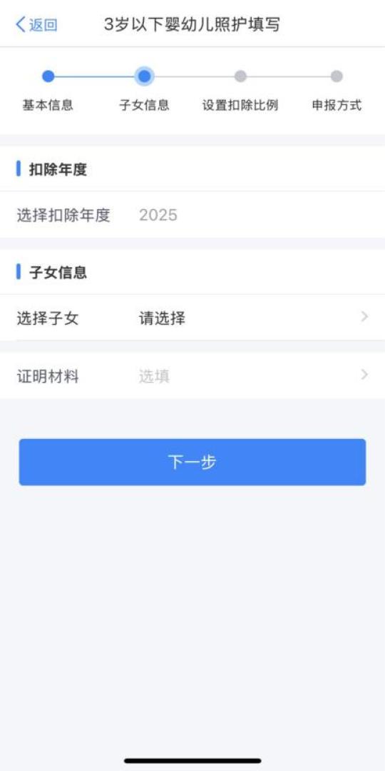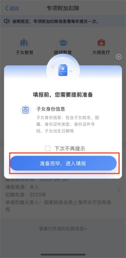 2.点击【3岁以下婴幼儿照护】,选择扣除年度,按照页面提示准备子女身份信息后点击【准备完毕,进入填报】开始填报。
