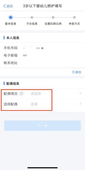 向左滑动3.核对【本人信息】,选择配偶信息,确认无误后点击下一步。