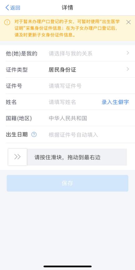 (2)身份证信息:婴幼儿已被赋予居民身份证号码的,证件类型也可选择“居民身份证”,并填写身份证号码和婴幼儿出生时间即可;