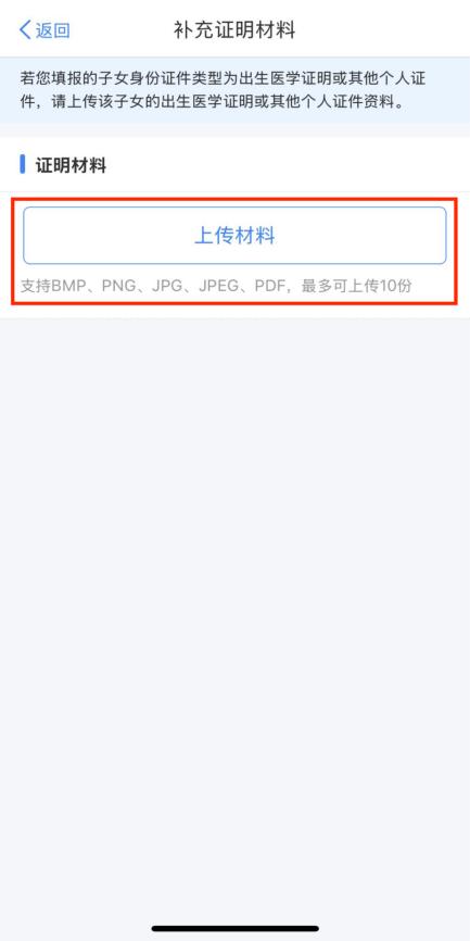 温馨提示:若初始无信息可点击下方【添加子女信息】填写,若有需要上传的证明材料可点击【证明材料】后上传。