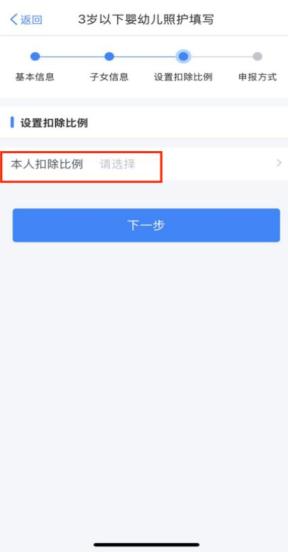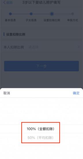 向左滑动5.设置扣除比例,点击【本人扣除比例】后根据实际情况选择【100%(全额扣除)】或者【50%(平均扣除)】,点击【下一步】。