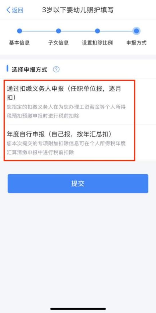 6.选择申报方式后点击【提交】完成填报。(两种方式的差异:选择通过扣缴义务人申报会由您指定的扣缴义务人每月为您办理预扣预缴申报时进行税前扣除,选择年度自行申报会在年度汇算清缴时按年汇总统一进行税前扣除)。
