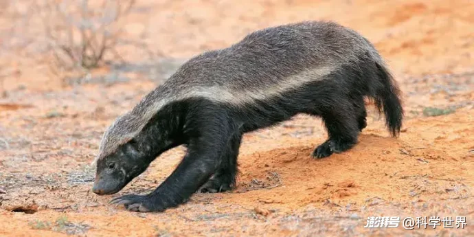 蜜獾广泛分布于撒哈拉沙漠以南的非洲大陆及阿拉伯半岛、印度等地,属于鼬科动物,体长约60~77厘米,尾长20~30厘米。蜜獾不仅能够适应温带雨林至寒冷高地的各种环境,还有着结实的体魄和凶猛的性格,会使用锐利的牙齿与前爪上长长的指甲撕开猎物,在砾漠和岩漠地带更是处于生态金字塔的顶端。蜜獾属于夜行性动物,白天通常在树洞或岩缝中休息,晚上则会外出捕猎。它们胃口很大,虽然是杂食性动物,但最为钟爱蜂蜜和蜜蜂的幼虫,会用尖爪破坏蜂巢来找寻这些食物。此外,它们对蛇的毒液也有着一定抵抗力,有时也会捕食毒蛇。