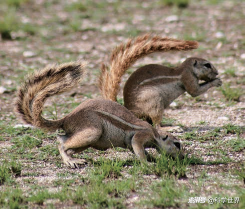 南非地松鼠生活在南非、博茨瓦纳、纳米比亚等地的干燥地区,体长约40~50厘米,背部呈黄褐色,腹部及手脚内侧则为白色,身体两侧各有1条白色的条纹,眼部和嘴部周围也都是白色的。它们会挖掘洞穴筑巢,主要以坚果、球根、草叶等植物为食。当温度过热时,它们就会竖起自己大大的尾巴,阻挡直射背部、头部的阳光,以此调节体温。照片拍摄于纳米布沙漠。