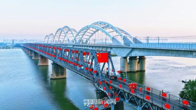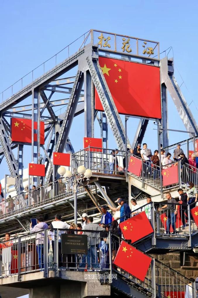 百年滨洲铁路桥在这个国庆再次披上庄严的“红妆”,成为最具人气的打卡地。“祝福祖国越来越好,越来越强大。”一位离乡20多年的游客第一次回家乡便来到这里打卡,她边走边拍,将红旗与江景一同纳入镜头。从滨洲铁路桥沿松花江畔向西而行,中央大街上,《我和我的祖国》《歌唱祖国》的歌声不绝于耳,游客、市民与志愿者们一起为祖国送上最真挚的祝福。中华巴洛克历史文化街区,一面76平方米的巨幅国旗成为最动人的背景板。悠扬的歌声从“巴洛克之声”阳台传来,“左右哥”的惊喜现身,用一句“来的全是自己人!”点燃了全场热情,欢声笑语在百年老街上空回荡……