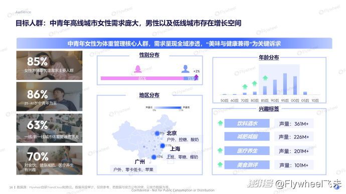那么,体重管理市场最主要的受众是哪些人呢?Flywheel飞未分析了目标人群的性别、年龄、地区及兴趣标签,最终发现,当前体重管理市场呈现出鲜明的人群特征,中青年、高线城市女性构成了绝对核心消费力量。